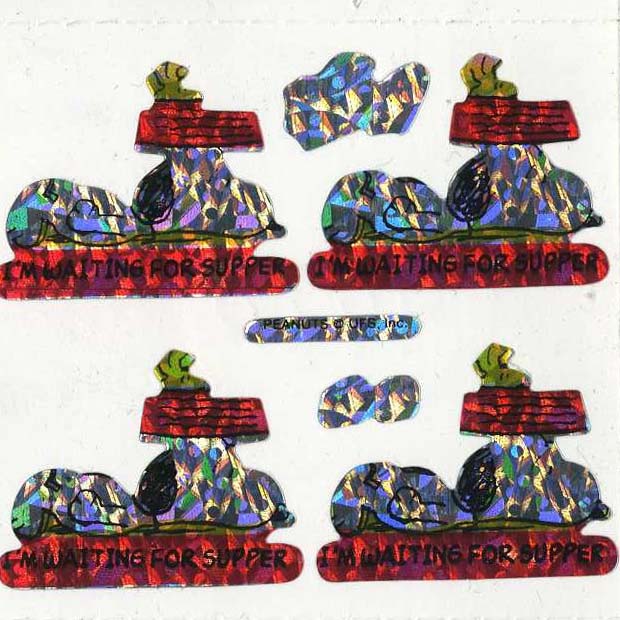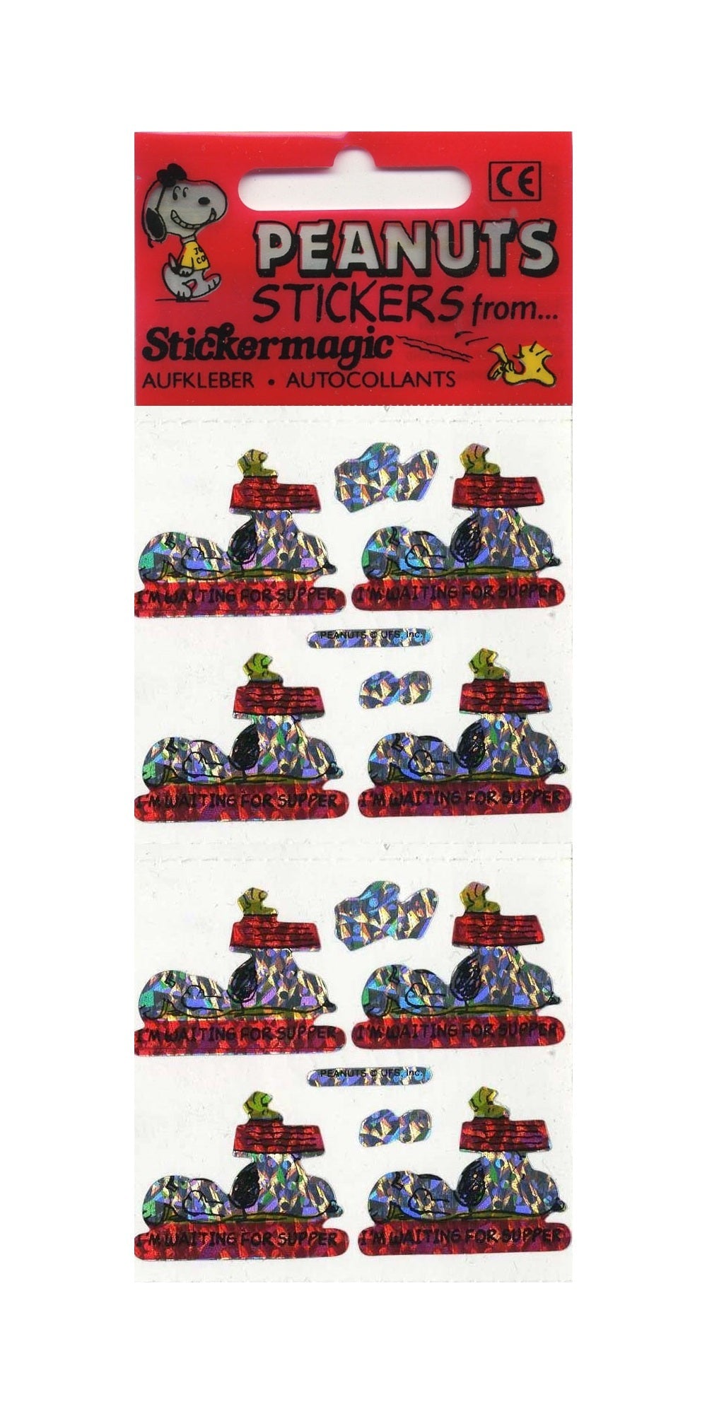 Glittery prismatic stickers featuring Peanuts characters including Snoopy, Charlie Brown, Lucy, Linus and Woodstock.